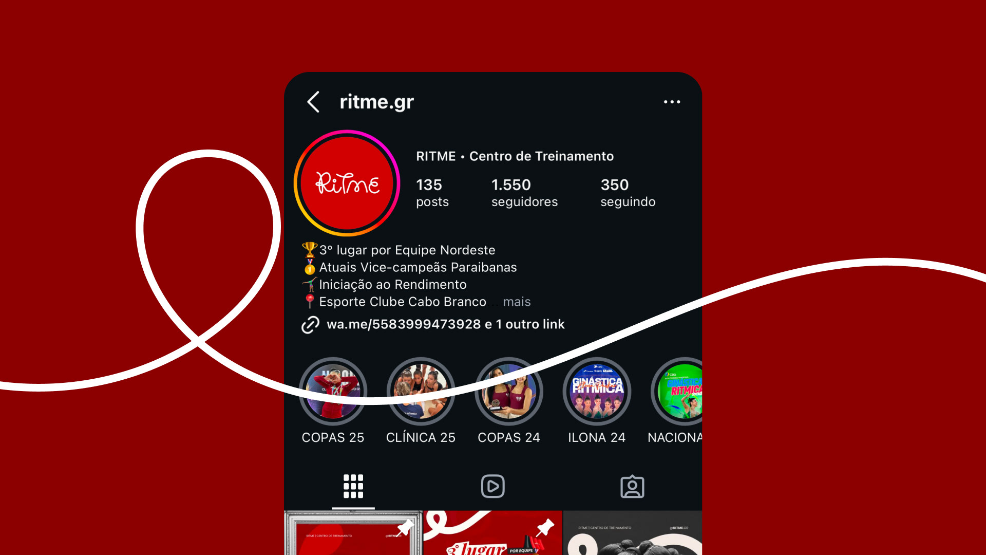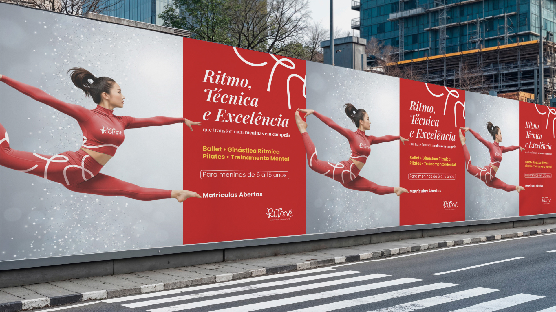 A identidade visual foi desenvolvida com foco na fluidez dos movimentos e na delicadeza da modalidade, equilibrando força e leveza. A paleta vermelho e branco traduz paixão e excelência, enquanto os elementos gráficos minimalistas fazem alusão aos aparelhos da GR, resultando em uma marca elegante, moderna e cheia de propósito.